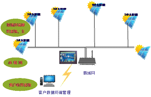1.太陽能工程現(xiàn)場安裝控制元器件、主板,通過局域網(wǎng)、廣域網(wǎng)連接客戶端、總部電腦主機,實現(xiàn)遠程操作;