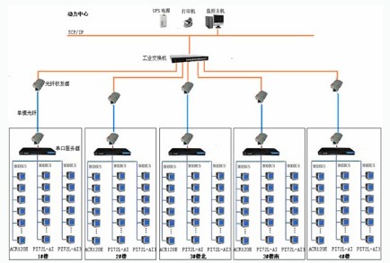 整個系統(tǒng)采用網(wǎng)絡(luò)分布式結(jié)構(gòu),監(jiān)控主機(jī)位于2#樓前面地下一層的動力中心中,其他5個配電室分別位于1#、2#、3#、4#地下一層(其中3#有南北兩個配電室)。該項目實現(xiàn)了淄博運(yùn)動員公寓4個樓內(nèi)電力系統(tǒng)的智能管理。設(shè)計方案為4個樓內(nèi)的5個配電室,通過光電轉(zhuǎn)換器經(jīng)過光纖拉倒2#樓前面地下一層的動力中心。5個配電室現(xiàn)場放置通訊機(jī)柜,儀表數(shù)據(jù)通過485接口,MODBUS通訊協(xié)議經(jīng)光電轉(zhuǎn)換器輸送到動力中心。