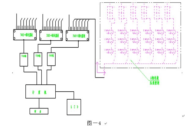 (2)GV系統的電極動態(tài)計算和管理功能。圖—4 是GV系統控制電極壓放的硬件原理圖,計算機直接驅動7685繼電器板,7685板驅動電極液壓夾鉗的松開、升起和下壓動作,完成執(zhí)行電極壓放的功能。實現該功能控制原理是:依據電極位置傳感器數據和電極做功點位置值的全部組合狀態(tài)值,在滿足四個邊界條件前提下(滿足電極不會出現軟斷和硬斷、電極升降油缸不觸及最高位置和最低位置),判斷電極長度是否滿足做功點所需長度的要求,動態(tài)調整電極壓放時間周期長短,將電極長度動態(tài)控制在冶煉需要的長度范圍內,從而實現不需要人工測量電極的操作。