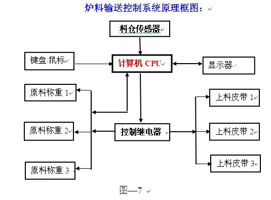 圖—8 所示為供料系統硬件原理圖,爐體上部料管和料斗安裝有料位計,料位計輸出DC0~5V信號給A/D板采樣轉換為數字信號供計算機計算,計算機依據料位計信 號和生產計劃下達的電石發(fā)氣量要求、原材料質量指標,控制7685繼電器板,驅動皮帶秤配料,并通過皮帶機輸送到爐體上部的料管內。