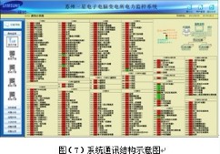 系統(tǒng)通訊結(jié)構(gòu)示意圖,主要顯示系統(tǒng)的組網(wǎng)結(jié)構(gòu),系統(tǒng)采用分層分布式結(jié)構(gòu),同時監(jiān)測間隔層設(shè)備的通信狀態(tài)。紅色表示通訊正常,綠色表示通訊故障。見圖(7)。