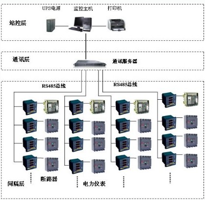 間隔層主要的設(shè)備為:多功能網(wǎng)絡(luò)電力儀表、開關(guān)量、模擬量采集模塊和智能斷路器等。這些裝置分別對(duì)應(yīng)相應(yīng)的一次設(shè)備安裝在電氣柜內(nèi),這些裝置均采用RS485通訊接口,通過(guò)現(xiàn)場(chǎng)MODBUS總線組網(wǎng)通訊,實(shí)現(xiàn)數(shù)據(jù)現(xiàn)場(chǎng)采集。
