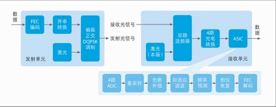 接收單元由本振激光、光電解調(diào)、ASIC芯片組成。本振激光采用大功率窄線(xiàn)寬可調(diào)諧激光器,雙路混頻器、4路光電轉(zhuǎn)換完成光電解調(diào),實(shí)現(xiàn)任意偏振態(tài)、任 意相位信號(hào)的相干接收,其中4路光電轉(zhuǎn)換采用雙PIN平衡接收,相比單PIN接收有更大的輸入光功率動(dòng)態(tài)范圍。ASIC芯片集成ADC和DSP功能,消除 傳輸損傷和恢復(fù)信號(hào)。采用CMOS技術(shù)的低功耗ASIC芯片,DSP算法類(lèi)似軟件無(wú)線(xiàn)電技術(shù),包括如下功能模塊:重采樣、色散補(bǔ)償、自適應(yīng)濾波、頻率補(bǔ) 償、相位恢復(fù)、SD-FEC解碼。