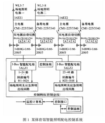 針對該體育館燈光控制要求,該體育場館的場地照明控制選用集散型分布智能照明控制系統(tǒng),以實現(xiàn)燈光的智能控制和能源的自動管理。智能照明配電控制系 統(tǒng)見圖1所示。該智能照明控制系統(tǒng)所控制的主要對象為該體育館場地照明系統(tǒng)、觀眾席照明系統(tǒng)、場地應(yīng)急照明、馬道檢修照明。按照各功能區(qū)域的不同照度要 求,該體育館在照明控制上采用各種控制方式。