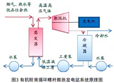 有機(jī)朗肯循環(huán)系統(tǒng)又稱雙循環(huán)系統(tǒng),是將工質(zhì)與含熱流體進(jìn)行熱交換之后,將氣態(tài)的工質(zhì)引入螺桿膨脹機(jī)主機(jī),推動(dòng)主機(jī)膨脹做功。對(duì)小于的0.1MPa的蒸 汽或壓力0.8MPa以下、高于85℃的熱水可以采用二次循環(huán)有機(jī)工質(zhì)螺桿膨脹機(jī)系統(tǒng)進(jìn)行余熱回收。而對(duì)200℃以上的煙氣可采用配余熱鍋爐的螺桿膨脹機(jī) 組進(jìn)行余熱回收。