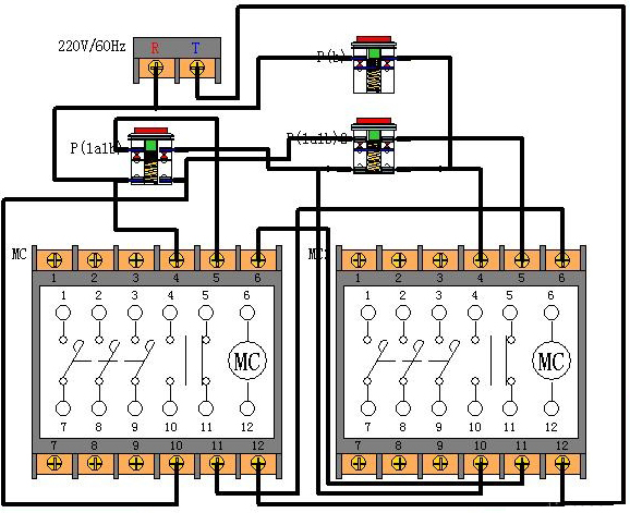 下面就接主回路,主回路需要2個接觸器,分別用于正轉(zhuǎn)和反轉(zhuǎn)時接通主回路,所以將兩個接觸器主觸頭的上端分別與三相交流電源的3條相線連接,而主觸頭 的下端對應(yīng)的觸頭上則要將其中任意兩條線互換一下,然后按照互換以后的順序接入電動機繞組連接好以后的3個連接片上(比如說三相電源ABC順序接到一個接 觸器上口,并在此處按照相同的順序與另外一個接觸器上口并聯(lián),然后其中一個接觸器的下口還按照ABC的順序引出線接到電機繞組連接片,而同時要按照ACB或BAC或CBA的順序?qū)⒁鼍€接到另外一個接觸器的下口),另外還要在接觸器到電機接線盒接線處之間先行串接熱繼電器的主接點,同時還要在電源引線與接觸器上口之間串接熔斷器。這樣全部回路大致接好了。