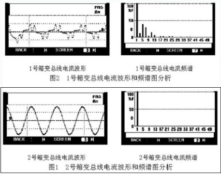 根據(jù)對負(fù)荷性質(zhì)分析和理論公式的推算,可以確定1號箱變400V系統(tǒng)中存在6k±1次為主的諧波電流。為了證實和明確1號箱變400V系統(tǒng)的諧波情況和參數(shù),對1號、2號箱變進(jìn)行了多次的對比測量。2號箱變總線電流波形和頻譜圖分析見圖1,1 號箱變總線電流波形和頻譜圖分析見圖2.