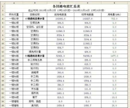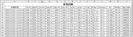 圖7為某段時(shí)間內(nèi)的進(jìn)線回路各項(xiàng)參數(shù)的具體數(shù)值,它詳細(xì)地記錄了進(jìn)線回路三相電壓、電流、有功電能、無功能電能、功率因素、頻率參數(shù)。整個(gè)廠區(qū)各回路電能匯總?cè)鐖D8所示,它記錄了某段時(shí)間內(nèi)各個(gè)回路的耗電情況,包括各回路進(jìn)行柜的總電能及分支電能。