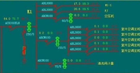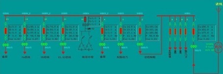 圖5為該廠區(qū)進(jìn)線回路配電圖,圖上顯示的參數(shù)都是主站軟件通過ZigBee無線網(wǎng)絡(luò)采集的各回路電力參數(shù)。圖6是廠區(qū)幾個(gè)主要配電柜的配電柜中K1柜的配電圖。圖上詳細(xì)顯示了K1配電柜各個(gè)回路的電力參數(shù)值,便于管理員更詳細(xì)的了解工廠的用電情況。