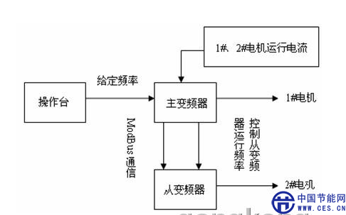 以其中的一臺(tái)變頻器為主機(jī),其余的變頻器為從機(jī),對(duì)變頻器的輸出電流進(jìn)行采樣比較,通過(guò)改變從機(jī)的控制信號(hào),使其始終跟隨主機(jī)而變化。當(dāng)從機(jī)的電流大于主機(jī)時(shí),降低從機(jī)的給定信號(hào),從而使從機(jī)的輸出頻率減小,電機(jī)轉(zhuǎn)速降低,負(fù)荷減輕,電流變?。划?dāng)從機(jī)的電流小于主機(jī)時(shí),提高從機(jī)的給定信號(hào),從而使從機(jī)的輸出增大,電機(jī)轉(zhuǎn)速升高,負(fù)荷加大,電流變大。最終使電機(jī)負(fù)荷基本一致,電流在允許的范圍內(nèi)。