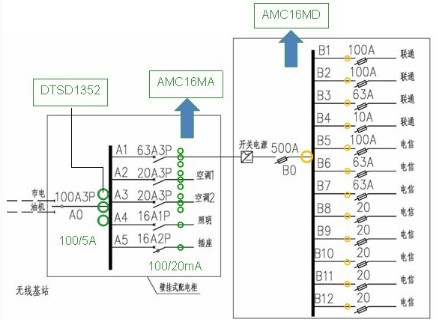 3.6、現(xiàn)場(chǎng)設(shè)備層可安裝電力儀表種類以某一配電箱為例,如下圖所示:市電、油機(jī)進(jìn)線投切點(diǎn)與出線配電柜距離較遠(yuǎn),在A0處配儀表DTSD1352并加裝電流互感器(鑒于是改造項(xiàng)目,推薦使用開(kāi)口式互感器),在A1~A5處配儀表AMC16MA并加裝電流互感器;在B0~B12處配AMC16MD儀表并加裝霍爾傳感器。