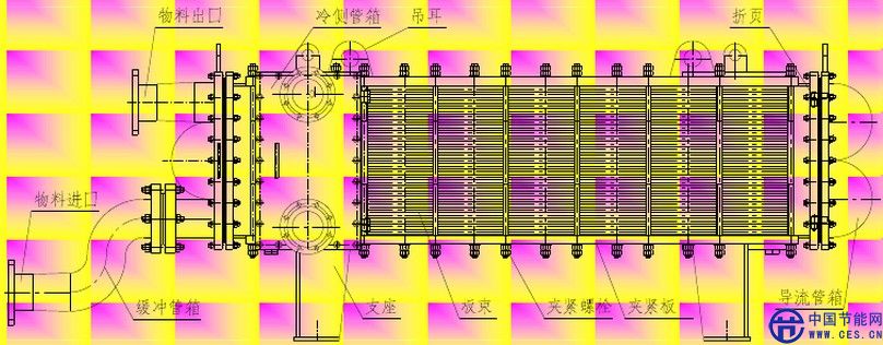 全焊式寬通道板式換熱器由換熱板束、側(cè)板、夾緊板、管箱、螺栓、螺母、密封墊片、分程隔板、支座等基本元件構(gòu)成。