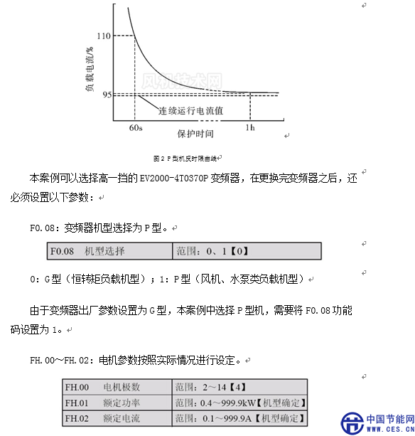 很多品牌的變頻器在45kW及以下機型都采用G/P合一方式,即用于恒轉矩負載G型適配電機功率比用于風機、水泵類負載P型時小一擋。G/P合一方式是考慮到風機、泵類負載基本不過載的實際情況,但是由于G/P合一的變頻器本質上并沒有擴大容量,只是變頻器的軟件發(fā)生變化,實際上就是反時限i2t曲線發(fā)生了變化,但使用中通常容易遭到誤解,尤其是當用戶的工藝過程發(fā)生變化,比如水泵流量增加、輸送介質的密度增大、風機風量增大等,電機的實際電流往往會上升,從而導致變頻器過載保護。