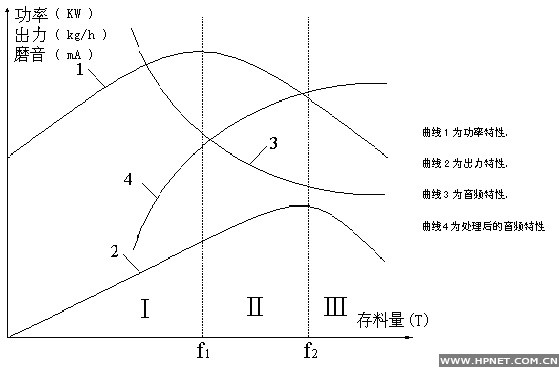 (2)在球磨機(jī)的運(yùn)行中,當(dāng)其內(nèi)物料量較少時(shí),因鋼球相互碰撞導(dǎo)致球磨機(jī)噪音(即音頻)信號(hào)較強(qiáng);隨著其內(nèi)物料量的不斷增加,鋼球間的空隙逐漸被物料填滿,因而球磨機(jī)噪音信號(hào)逐漸減弱。當(dāng)球磨機(jī)出力達(dá)到最大時(shí)(圖中f2點(diǎn)),鋼球間填滿了物料,噪音信號(hào)也就基本不變了。反映在圖中曲線3,噪音信號(hào)變得非常平坦。可以利用噪音曲線到達(dá)最大出力點(diǎn)后變化率很小這一特性,來(lái)跟蹤球磨機(jī)最佳工作狀態(tài)。