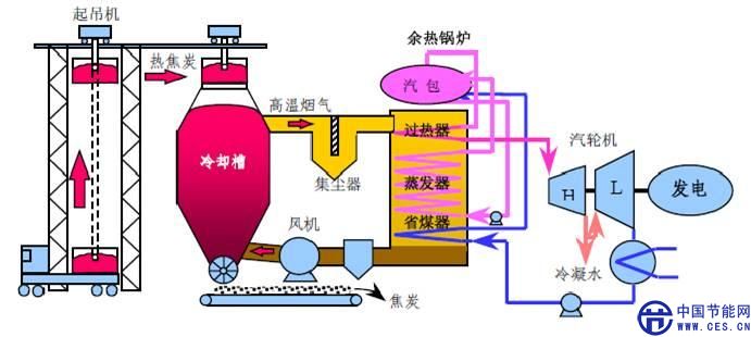 傳統(tǒng)的熄焦方法采用噴水降溫,紅焦顯熱浪費很大。干熄則吸收紅焦的80%左右的熱量使之產(chǎn)生蒸汽。