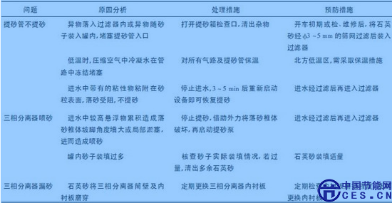 2010 年2 月流砂過濾器投入運行,調(diào)試過程中相繼出現(xiàn)提砂管不提砂、三相分離器向上噴砂或漏砂、布水不均勻等問題。主要問題及處理情況見表2。