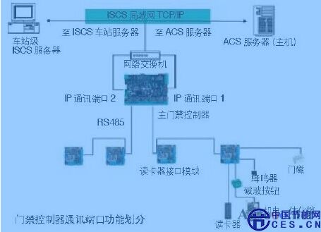 控制器的一個TCP/IP端口通過ISCS網(wǎng)絡(luò)連接至門禁服務(wù)器,實(shí)現(xiàn)控制中心門禁服務(wù)器與門禁控制器的連接,接受控制中心門禁服務(wù)器和管理工作站對門禁控制器的運(yùn)行參數(shù)設(shè)置、授權(quán)管理、遠(yuǎn)程控制,上傳門禁控制器事件信息??刂破魍ㄟ^另一個TCP/IP端口連接至ISCS管理工作站,實(shí)現(xiàn)ISCS系統(tǒng)對門禁設(shè)備的運(yùn)行狀態(tài)的實(shí)時(shí)監(jiān)視、報(bào)警事件處理、遠(yuǎn)程控制等功能。