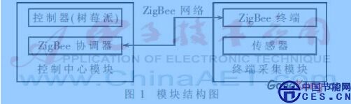 1.1 總體模塊設計 本系統(tǒng)為了能夠實現(xiàn)可移動性,采用模塊化的設計方式,將系統(tǒng)分為終端采集模塊以及控制中心模塊,模塊結構圖如圖1所示。終端采集模塊由傳感器與ZigBee終端組成,主要實現(xiàn)居室環(huán)境信息采集以及數(shù)據傳送功能;控制中心模塊由控制器樹莓派與ZigBee協(xié)調器組成,主要完成對各終端節(jié)點傳送數(shù)據的接收以及數(shù)據處理,顯示居室環(huán)境參數(shù)狀況以及與Internet網絡進行通信。