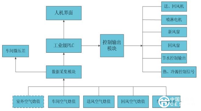 根據(jù)回風(fēng)溫濕度與設(shè)定值的參數(shù)偏差,通過(guò)CPU的控制算式,自動(dòng)分析確定控制送風(fēng)溫度、回風(fēng)溫度在要求的控制范圍內(nèi),以滿足生產(chǎn)工藝及舒適度要求。