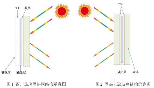 隔熱夾膠玻璃結(jié)構(gòu)主要包括玻璃、PVB膠膜和隔熱膜。其中,PVB主要起與玻璃粘結(jié)的作用,賦予玻璃防碎防爆的安全功能;隔熱層具有阻隔紫外線和紅外熱線的作用,其結(jié)構(gòu)原理如圖2所示。