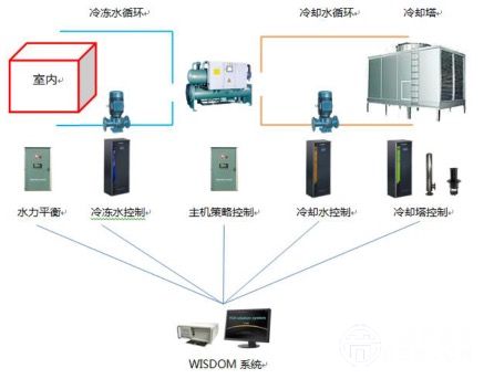 該技術(shù)以冷卻塔變流量技術(shù)為前提,冷卻塔模塊根據(jù)采集的數(shù)據(jù),在盡可能降低冷卻水溫度的前提下,使冷卻塔風(fēng)機(jī)節(jié)省電能;冷卻泵模塊根據(jù)采集的數(shù)據(jù),控制冷卻泵運(yùn)轉(zhuǎn)速度以及數(shù)量提高系統(tǒng)輸送系數(shù);主機(jī)策略模塊根據(jù)冷機(jī)的特性,控制冷機(jī)工作在高效區(qū);冷凍泵控制模塊在雙變流量技術(shù)的硬件支持下,達(dá)到末端與主機(jī)流量的互調(diào),降低冷凍泵用電量;水力平衡模塊負(fù)責(zé)調(diào)節(jié)各個支路的流量。利用配套研發(fā)的WISDOM平臺,實(shí)現(xiàn)整個系統(tǒng)的智能化節(jié)能運(yùn)行,其系統(tǒng)原理圖見圖1。