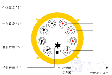 目前,全國(guó)居民用水戶通常使用的是DN15~25機(jī)械水表。水表表盤上共有8個(gè)數(shù)碼指針,其中4個(gè)紅色,4個(gè)黑色,讀數(shù)的單位為立方米。紅色指針表示不到1立方米,代表小數(shù)點(diǎn)后的讀數(shù),一般情況下不用讀出。黑色指針中,“×1”代表個(gè)位數(shù),“×10”代表十位數(shù),“×100”代表百位數(shù),“×1000”代表千位數(shù)。每一擋的指針,若處在二個(gè)數(shù)之間,則讀上一個(gè)數(shù),如圖所示:千位針處在1和2之間,讀1;百位針處在5和6之間,讀5;十位針處在1和2之間,讀1;個(gè)位針處在3與4之間,讀3:所以圖中水表行碼的正確讀數(shù)為1513立方米。