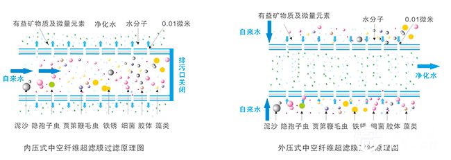 自來水進(jìn)入超濾膜內(nèi),在水壓差的作用下,水分子及對人體有益的礦物質(zhì)和微量元素透過膜表面的微孔,成為凈化水;而水中泥沙、鐵銹、膠體、細(xì)菌及大分子有機(jī)物等雜質(zhì)的直徑大于0.01微米,所以被截留在超濾膜內(nèi),沖洗時排污口打開,雜質(zhì)在沖洗過程中排出。
