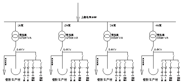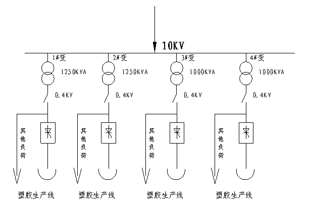 公司由一路10KV進線,廠內(nèi)安裝1250KVA整流變壓器2臺,1000KVA整流變壓器2臺,均為10KV/0.4KV。4臺整流變壓器分別帶4條塑膠生產(chǎn)線,如下圖: