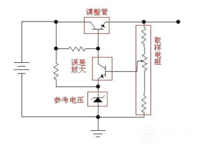 讓我們繼續(xù):如果我們用一個三極管或者場效應管,來代替圖中的可變阻器,并通過檢測輸出電壓的大小,來控制這個“變阻器”阻值的大小,使輸出電壓保持恒定,這樣我們就實現(xiàn)了穩(wěn)壓的目的。這個三極管或者場效應管是用來調(diào)整電壓輸出大小的,所以叫做調(diào)整管。