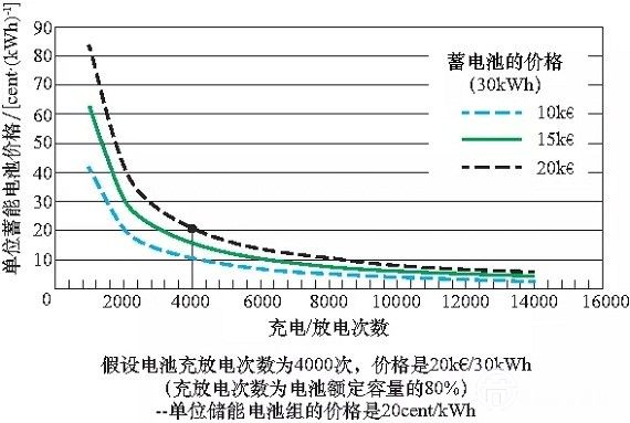 在未來,預(yù)計儲能電池技術(shù)的市場價格競爭力會朝向更有利的方向發(fā)展。目前,儲能電池的采購價格很高,約為800~1000/kW,且設(shè)備壽命周期有限,充電周期最多為2000~3000次,僅在某些特殊情況下(如負(fù)荷削峰需求較少時),儲能電池在經(jīng)濟(jì)上是可行的,這時儲能電池可作為配電系統(tǒng)的一部分,可用于削減峰荷,并可作為備用電源。一塊儲能電池的單位能量價格(充電或放電一次)平均為20cent/kWh,見圖7。目前儲能電池的單位能量價格最低能達(dá)到10cent/kWh。假設(shè)儲能電池的能量單位價格可以降到2~4cent/kWh,則意味著電池投資價格為200/kW時,充電次數(shù)可達(dá)到5000~10000次;如果電池的投資價格為400~500/kW時,充電次數(shù)則可達(dá)到15000次,那么在未來配電網(wǎng)中儲能電池的應(yīng)用前景將是非常顯著的。