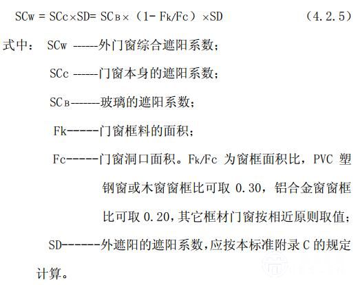在直射陽光照射的時間段內,太陽輻射透過窗戶(包括窗框、窗玻璃)所形成的室內得熱量,與相同條件下透過3mm透明白玻璃的太陽輻射得熱量之比。外門窗遮陽系數(SCc)與玻璃遮陽系數(SCB)及窗框面積(Fk)有關。