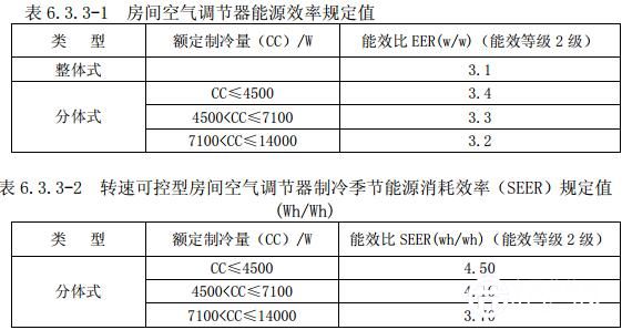 6.3.3居住建筑采用分散式房間空調器進行空調和(或)采暖時,其能效比、性能系數應符合國家現行節(jié)能型產品的規(guī)定值,見表6.3.3-1、6.3.3-2。