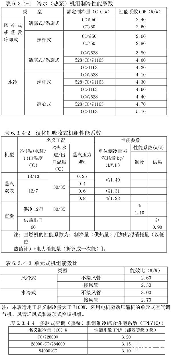 6.3.4居住建筑采用集中空調時,作為集中冷(熱)源的機組,其性能系數應符合現行國家標準《公共建筑節(jié)能設計標準》GB50189中的規(guī)定值,見表6.3.4-1、6.3.4-2、6.3.4-3、6.3.4-4。并優(yōu)先選用能效比較高的設備。(不僅要考慮滿負荷的能效比,還應著重分析比較部分負荷的能效比)