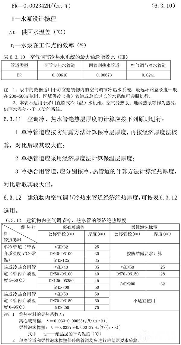 6.3.10空氣調節(jié)冷熱水系統的輸送能效比(ER)應按式(6.3.10)計算且不應大于表6.3.10的規(guī)定。