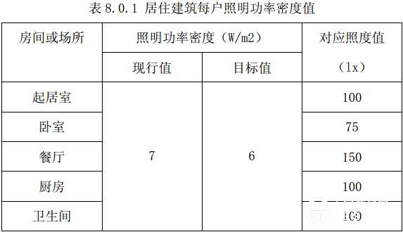 8.0.1居住建筑每戶照明功率密度值不宜大于表8.0.1的規(guī)定。當房間或場所的照度值高于或低于本表規(guī)定的對應照度值時,其照明功率密度值應比例提高或折減。