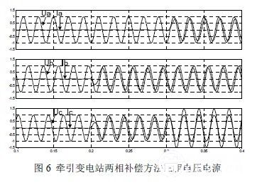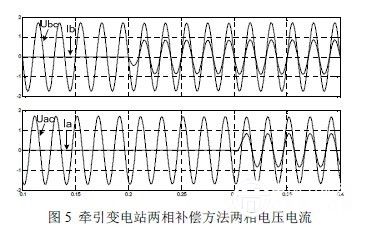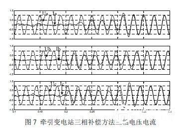 從圖6 可知,采用兩相補(bǔ)償方法后,牽引變壓器原邊三相電流與電壓存在相位差,且三相電流幅值也不相同,三相綜合功率因數(shù)較低,存在嚴(yán)重的負(fù)序電流,在機(jī)車(chē)容量較大時(shí),將影響110KV 供電段的電能質(zhì)量。