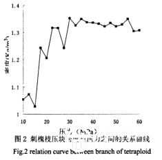 2.5MPa做一次實(shí)驗(yàn),試驗(yàn)結(jié)果如圖2。在壓力較低時(shí)(10~20PMa)壓塊密度隨成型壓力的增大以較大的幅度增大,壓力大于20MPa的條件下,壓塊密度隨成型壓力的增大變化趨于穩(wěn)定,壓縮前后的體積比分布在5.16~5.97之間。四倍體刺槐枝韌性好,纖維含量高,在較小壓力下壓制的成型塊也很堅(jiān)實(shí)。