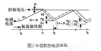 如圖2所示,在t0時(shí)刻,開關(guān)管被導(dǎo)通,這時(shí)初級(jí)線圈電流以斜率m1上升,該斜率是輸入電壓和電感的函數(shù)。在t1時(shí)刻,電流取樣輸入到達(dá)了電流檢測(cè)比較器的門限,將導(dǎo)致開關(guān)管關(guān)閉,電流以斜率m2衰減,直到下一個(gè)開關(guān)周期的到來。如果有一個(gè)擾動(dòng)加在電流檢測(cè)比較器的門限電壓上,產(chǎn)生了一個(gè)小的△I(如圖2中虛線所示),就會(huì)發(fā)生不穩(wěn)定的現(xiàn)象。在一個(gè)固定的振蕩周期內(nèi),電流衰減時(shí)間減少,最小電流在開關(guān)管導(dǎo)通時(shí)刻(t 2)上升了△I+m 2/m 1。最小電流在下一個(gè)周期(t 3)減小到(△I+m 2/m 1)˙(m 2/m 1)。