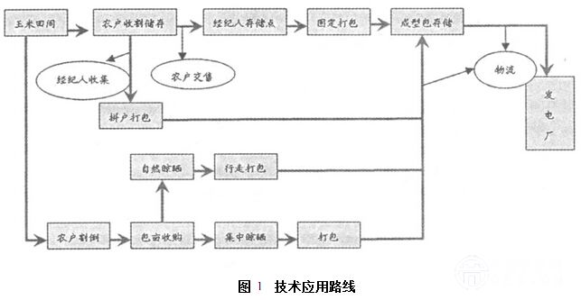 在我國,生物質(zhì)原料數(shù)量雖然巨大,但來源較為分散,與西方農(nóng)場化耕作模式有較大的差別,為適合我國的國情,需要建立一套科學(xué)合理的收集體系。生物質(zhì)燃料的原料主要是農(nóng)林業(yè)廢棄物,存在著季節(jié)性強,收集運輸困難的問題。農(nóng)業(yè)生產(chǎn)分布在面積廣闊的農(nóng)田上,農(nóng)作物收割后秸稈廣泛的分布在農(nóng)村地區(qū),且秸稈體積大,不便于運輸;樹枝等林業(yè)廢棄物絕大部分分布在山區(qū),交通不便,收集工作量大。因此,如何建立科學(xué)穩(wěn)定收、儲、運體系是保證生物質(zhì)直燃電廠穩(wěn)步發(fā)展、安全供應(yīng)的物質(zhì)基礎(chǔ)。技術(shù)應(yīng)用路線見圖1
