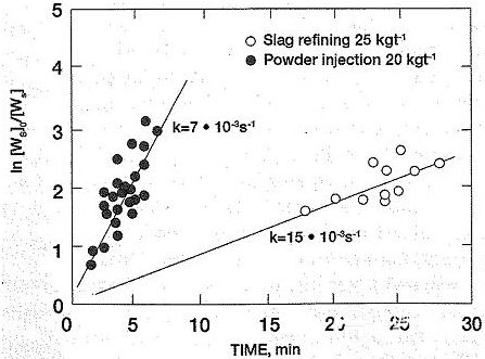 在LF站噴粉或喂線是常見的鋼水脫硫操作。圖4給出這兩種脫硫技術(shù)的脫硫效率,由于目標(biāo)是實(shí)現(xiàn)在無渣參與的情況下通過反應(yīng)劑和金屬反應(yīng)獲得所需脫硫效果,關(guān)鍵問題是反應(yīng)產(chǎn)物CaS的上浮。而且,CaSi或CaC2的使用總是導(dǎo)致鋼中增硅或增碳,這對(duì)某些鋼種而言可能是嚴(yán)重問題。