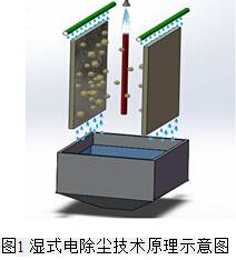 濕式電除塵器和與干式電除塵器的收塵原理相同,都是靠高壓電暈放電使得粉塵荷電,產(chǎn)生大量電子和離子,在電場(chǎng)力的作用下向兩極移動(dòng)過程中,碰撞到煙氣中的粉塵顆粒使其荷電,荷電粉塵在電場(chǎng)力作用下與氣流分離向極板或極線運(yùn)動(dòng),荷電粉塵到達(dá)極板或極線時(shí)由靜電力吸附在極板或極線上,從而使煙氣凈化。但在對(duì)集塵板上捕集到的粉塵清除方式上WESP與DESP有較大區(qū)別,干式電除塵器一般采用機(jī)械振打或聲波清灰等方式清除電極上的積灰,而濕式電除塵器則采用沖刷液沖洗電極,在極板上形成連續(xù)的液膜,使粉塵隨著沖刷液的流動(dòng)而清除。