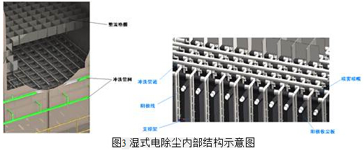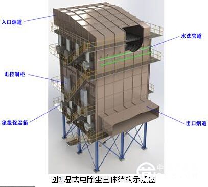 濕式靜電除塵器主要由進(jìn)出口煙道、除塵器殼體、導(dǎo)流板、整流格柵、陽極收塵板、陰極線、絕緣箱、沖洗水系統(tǒng)、電源及控制系統(tǒng)等組成。