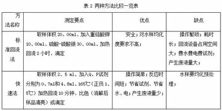 目前,測定化學需氧量常用的方法有:重鉻酸鉀法、庫侖滴定法、快速密閉消解滴定法或光度法及氯氣校正法等。對于特殊含高氯廢水采用氯氣校正法。我們通常采用重鉻酸鉀法(也稱標準回流法)和快速法。下面將這兩種方法加以比較,根據(jù)工作任務需要選擇適宜的方法進行分析。
