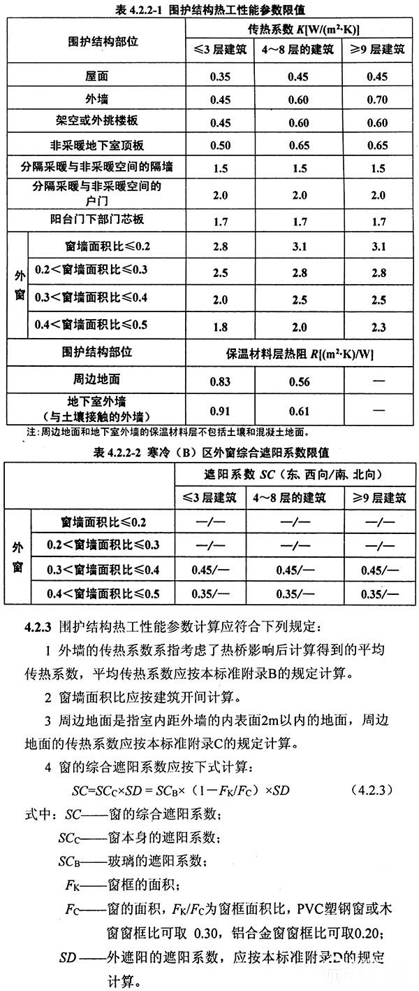 4.1一般規(guī)定 4.1.1建筑群的總體布置,單體建筑的平面、立面設計和門窗的設置,應考慮冬季利用日照并避開冬季主導風向。 4.1.2建筑物宜朝向南北或接近朝向南北。建筑物不宜設有三面外墻的房間,一個房間不宜在不同方向的墻面上設置兩個或更多的窗。 4.1.3寒冷地區(qū)居住建筑的體形系數(shù)不應大于表4.1.3規(guī)定的眼值。當體形系數(shù)大于表4.1.3規(guī)定的眼值時,必須按照本標準第4.4節(jié)的要求進行圍護結構熱工性能的權衡判斷。