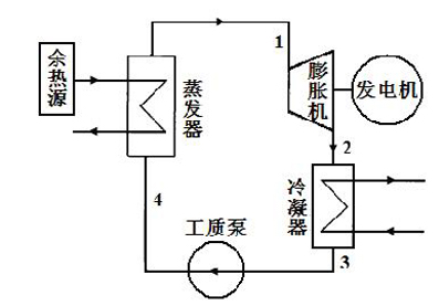 有機(jī)朗肯循環(huán)(OrganicRankine Cycle,簡(jiǎn)稱(chēng)ORC),又稱(chēng)雙循環(huán),是一種新型環(huán)保型的發(fā)電技術(shù)。有機(jī)朗肯循環(huán)的基本原理與常規(guī)的朗肯循環(huán)類(lèi)似。兩者最大的區(qū)別是有機(jī)朗肯循環(huán)的工質(zhì)是低沸點(diǎn)、高蒸汽壓的有機(jī)工質(zhì),而不是水。有機(jī)朗肯循環(huán)系統(tǒng)由蒸發(fā)器、膨脹機(jī)、冷凝器和工質(zhì)泵組成,如下圖所示。工質(zhì)在蒸發(fā)器中從低溫?zé)嵩粗形諢崃慨a(chǎn)生有機(jī)蒸氣,進(jìn)而推動(dòng)膨脹機(jī)旋轉(zhuǎn),帶動(dòng)發(fā)電機(jī)發(fā)電,在膨脹機(jī)做完功的乏氣進(jìn)入冷凝器中重新冷卻為液體,由工質(zhì)泵打入蒸發(fā)器,完成一個(gè)循環(huán)。