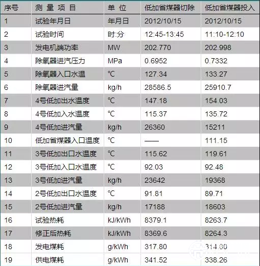 項目實施完成后,隨主機A檢啟動同步投入運行,在機組修后性能試驗時同步對低溫省煤器效果進行了測試,結果如下: