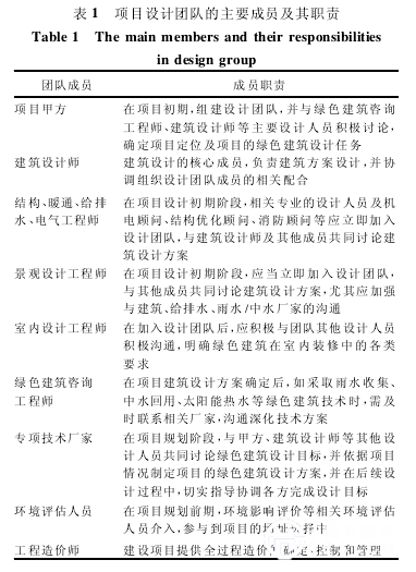 綠色建筑設(shè)計(jì)團(tuán)隊(duì)人員更加復(fù)雜。在原有人員的基礎(chǔ)上,又增加了綠色建筑咨詢顧問、綠色建筑專項(xiàng)技術(shù)廠家等。在不同的設(shè)計(jì)階段有不同的人員參與到設(shè)計(jì)團(tuán)隊(duì)中,在充分理解綠色建筑目標(biāo)的基礎(chǔ)上協(xié)調(diào)一致,確保項(xiàng)目目標(biāo)的完整實(shí)現(xiàn)。團(tuán)隊(duì)主要成員及其職責(zé)如表1 所示。