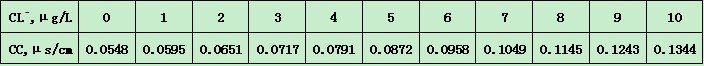 表2:氯離子與氫電導(dǎo)率的關(guān)系(25℃,無其他陰離子)