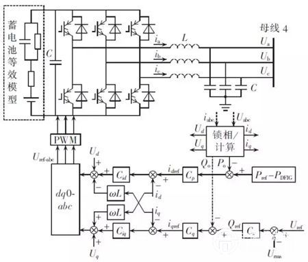 儲能系統(tǒng)配置在DFIG并網(wǎng)點附近,與 DFIG聯(lián)合運行。下圖為儲能系統(tǒng)的結(jié)構(gòu)及對應(yīng)的控制策略。