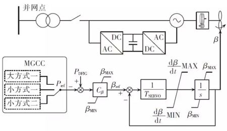 在風(fēng)速擾動過程中,小方式二下DFIG快速變槳控制可有效提高微電網(wǎng)靜態(tài)電壓穩(wěn)定性,其控制策略如下圖所示。